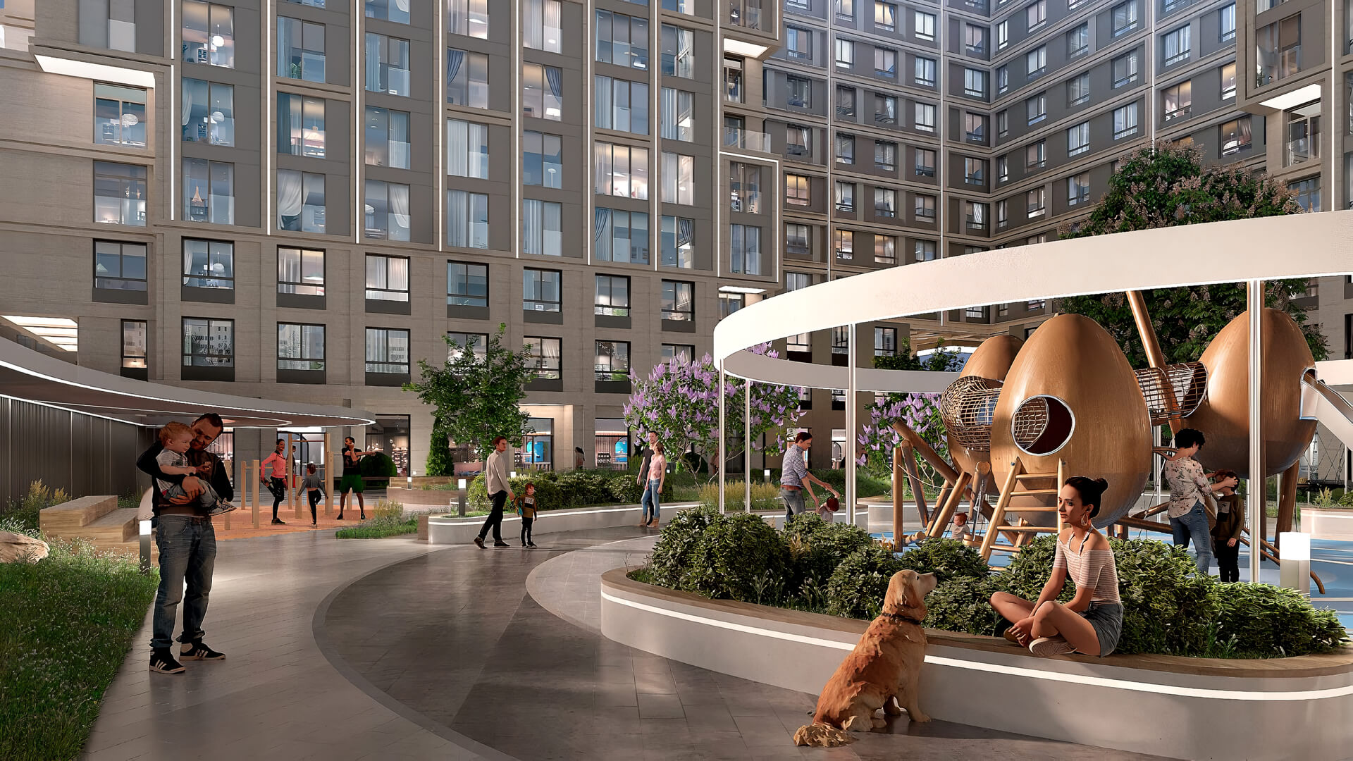 Двор жилого комплекса «EVOPARK Сокольники» – это оазис спокойствия и гармонии в центре Москвы. Пространство разделено на несколько функциональных зон, каждая из которых предназначена для отдыха и активного времяпрепровождения. Здесь вы найдете детские игровые площадки, зоны для занятий спортом, тихие уголки для отдыха и прогулочные аллеи, окруженные зеленью. Особое внимание уделено озеленению: множество деревьев и растений создают ощущение единения с природой и делают двор уютным и привлекательным.